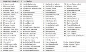 Na sobotní mykologické akci 31.5. bylo přítomno 21 členů. Navštívili jsme několik lesních lokalit v okolí Skašova, Letin a Měčína. Převládají zde smíšené nebo listnaté porosty s hojnou hajní květenou. Po skončení jsme v obci Skašov v restauraci na koupališti provedli určování sebraných hub. Celkem jsme popsali a vystavili 85 hub a 3 hlenky. Seznam připojen níže.