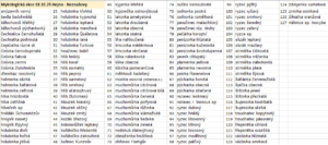 Početně převládaly jako vždy holubinky (14 druhů) a dále ryzce (11 druhů), časté byly i muchomůrky, čirůvky a pavučince. Mezi vzácnějšími byl hřib kovář žlutý, štítovka hlízečkatá, trhankau dřípená a rosolovec červené. Překvapil nás také nález ryzce zlatomléčného a to dokonce ve větším množství. Součástí výstavy byla i jedna z nejléčivějších hub – rezavec šikmý (tzv. ČAGA SIBIŘSKÁ).